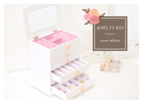 ジュエリーボックス6段収納 バラ取手(木製 大容量 可愛い かわいい 姫系 ネックレス 鏡付き 完成品 薔薇 ローズ ジュエリー収納 アクセサリー収納 アクセサリーケース ジュエリーケース ジュエリーBOX 宝石箱 指輪 ピアス 白 茶色)